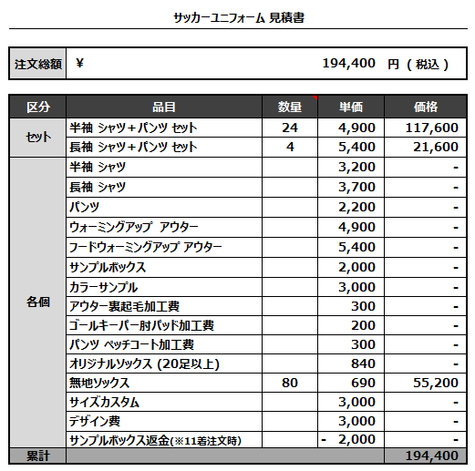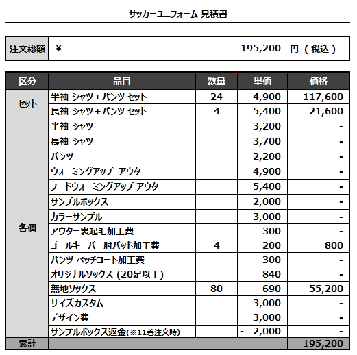 注文するユニフォームの最終デザインと見積もりの数量を確認ください。