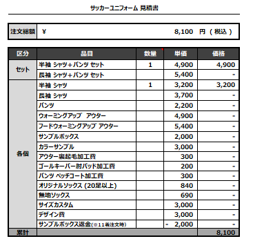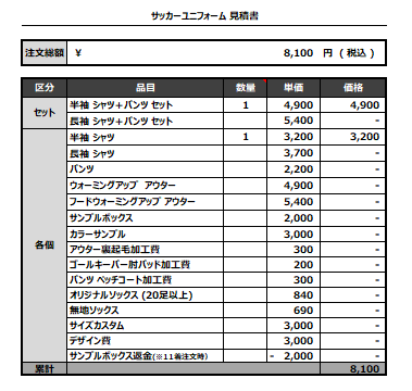 注文するユニフォームの最終デザインと見積もりの数量を確認ください。