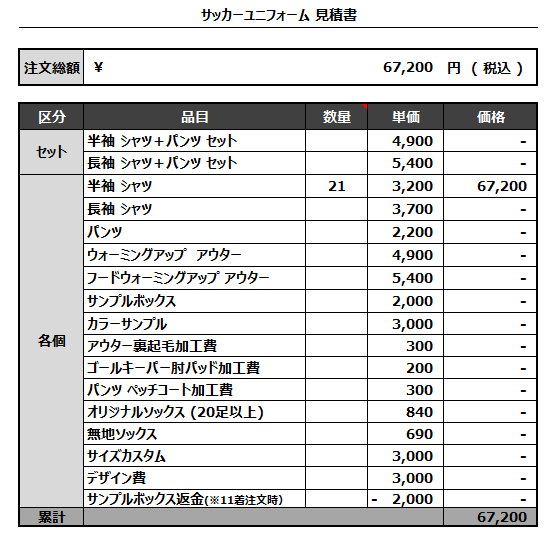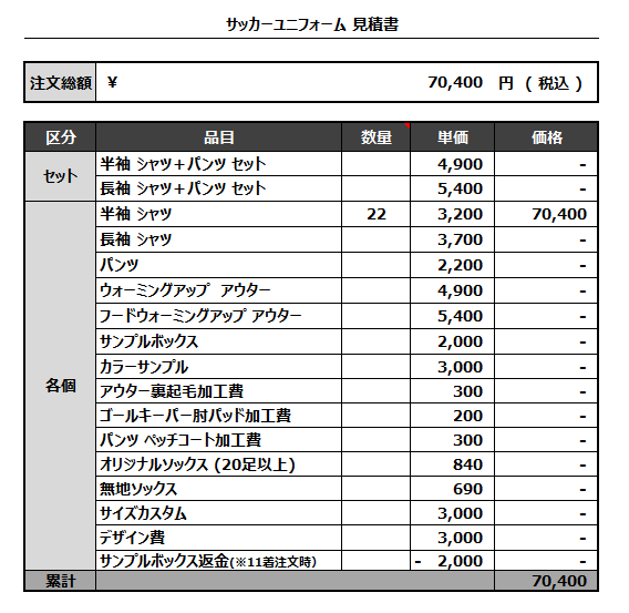 注文するユニフォームの最終デザインと見積もりの数量を確認ください。