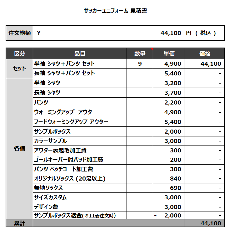 注文するユニフォームの最終デザインと見積もりの数量を確認ください。