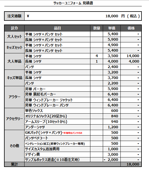 注文するユニフォームの最終デザインと見積もりの数量を確認ください。