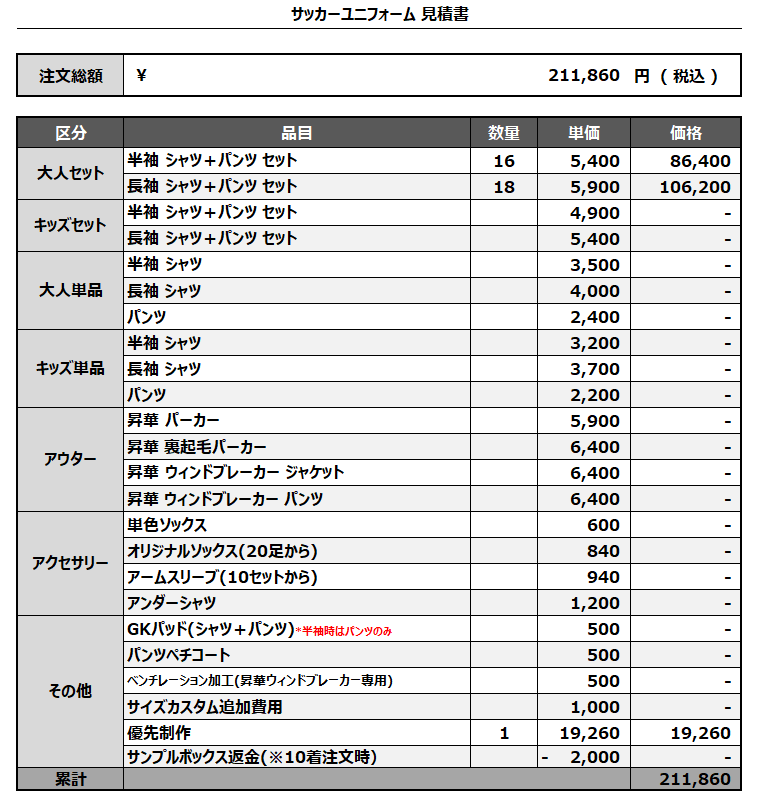 注文するユニフォームの最終デザインと見積もりの数量を確認ください。
