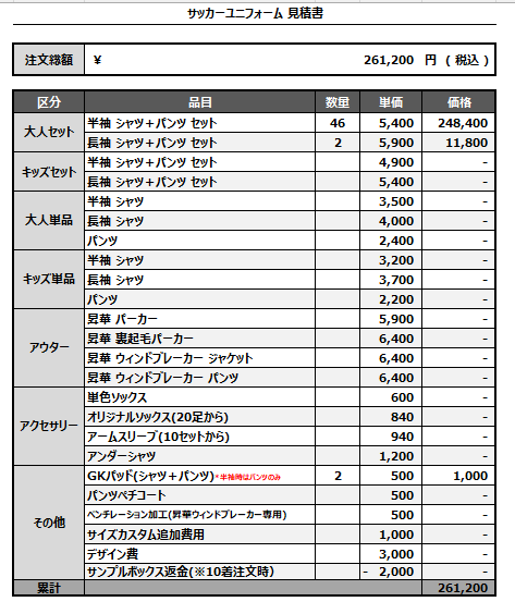 注文するユニフォームの最終デザインと見積もりの数量を確認ください。