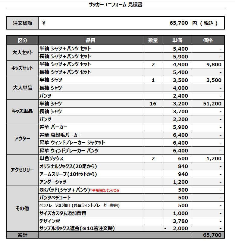 注文するユニフォームの最終デザインと見積もりの数量を確認ください。