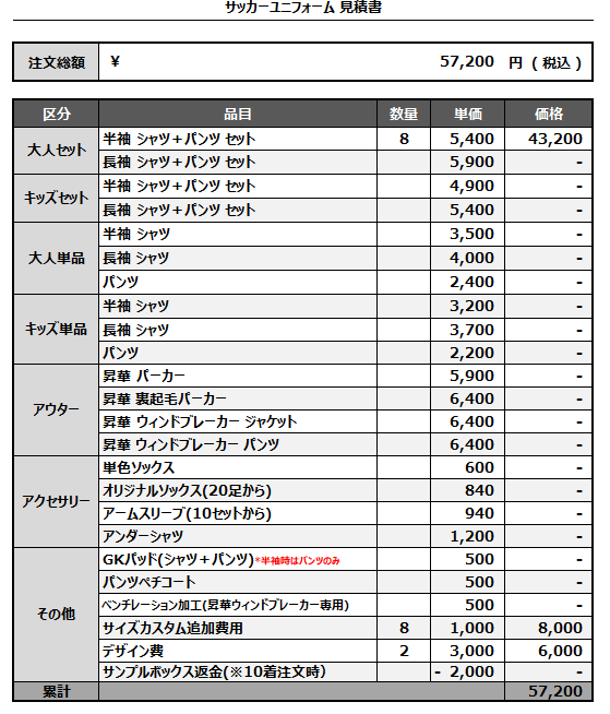 注文するユニフォームの最終デザインと見積もりの数量を確認ください。