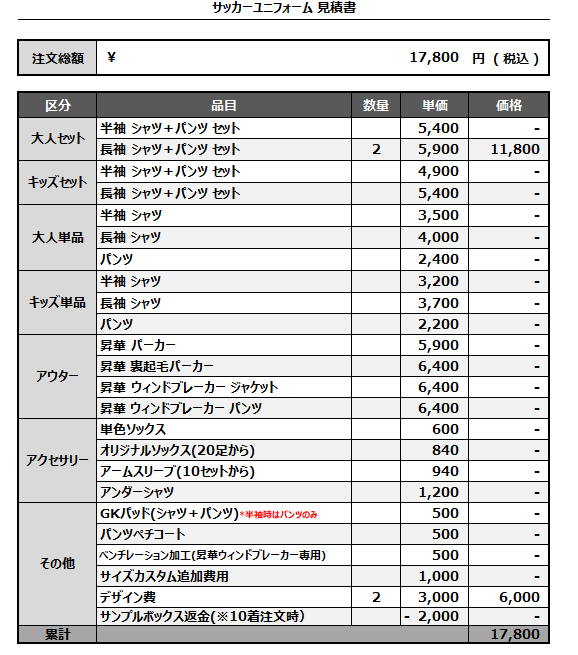 注文するユニフォームの最終デザインと見積もりの数量を確認ください。