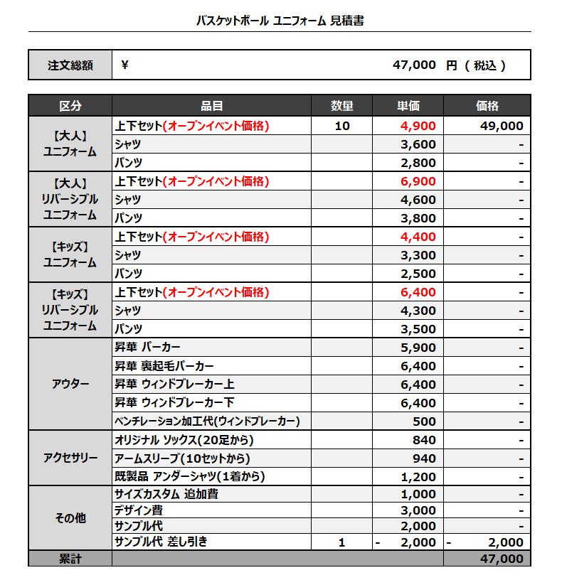 注文するユニフォームの最終デザイン、価格、数量をご確認ください。