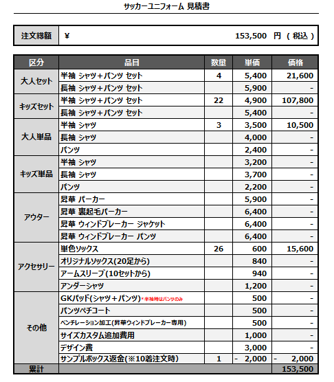 注文するユニフォームの最終デザインと見積もりの数量を確認ください。