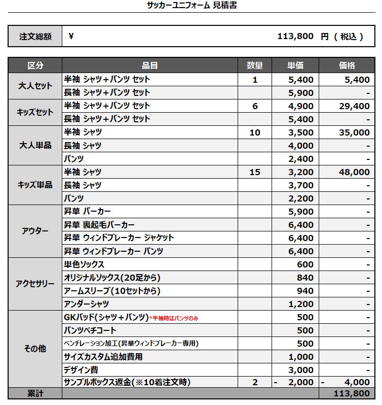 注文するユニフォームの最終デザインと見積もりの数量を確認ください。
