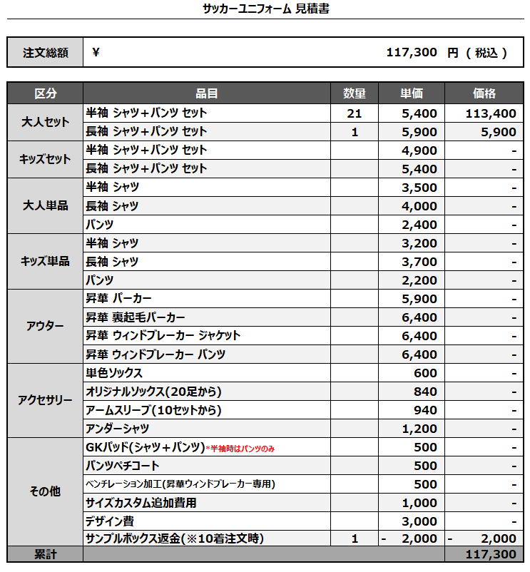 注文するユニフォームの最終デザインと見積もりの数量を確認ください。
