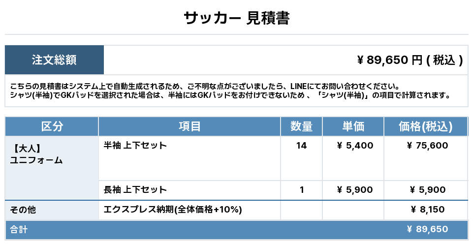 注文するユニフォームの最終デザインと見積もりの数量を確認ください。