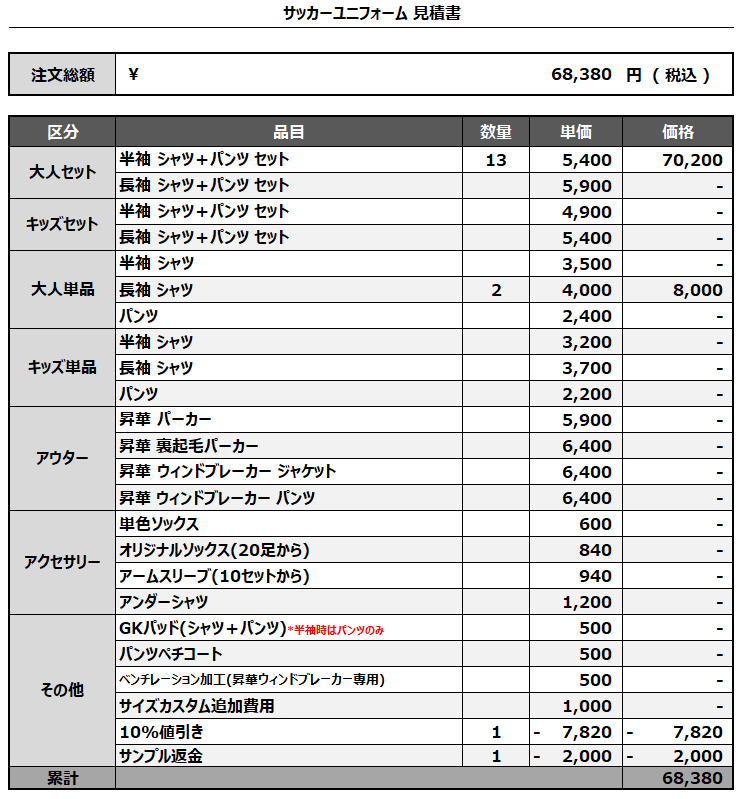 注文するユニフォームの最終デザインと見積もりの数量を確認ください。