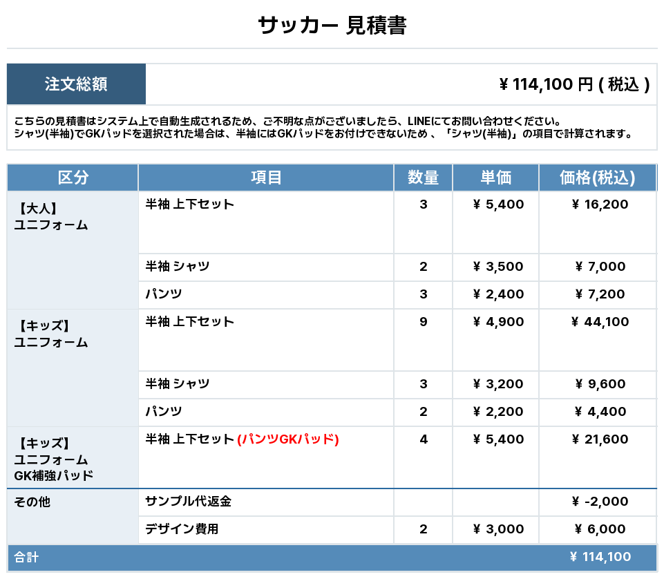 注文するユニフォームの最終デザインと見積もりの数量を確認ください。