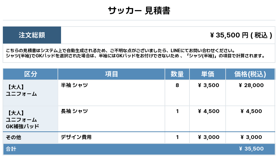 注文するユニフォームの最終デザインと見積もりの数量を確認ください。