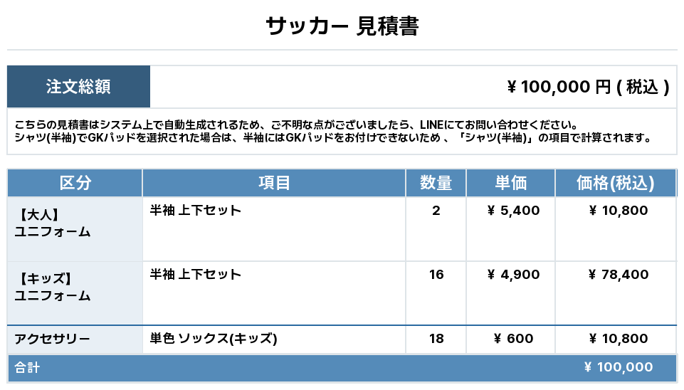 注文するユニフォームの最終デザインと見積もりの数量を確認ください。