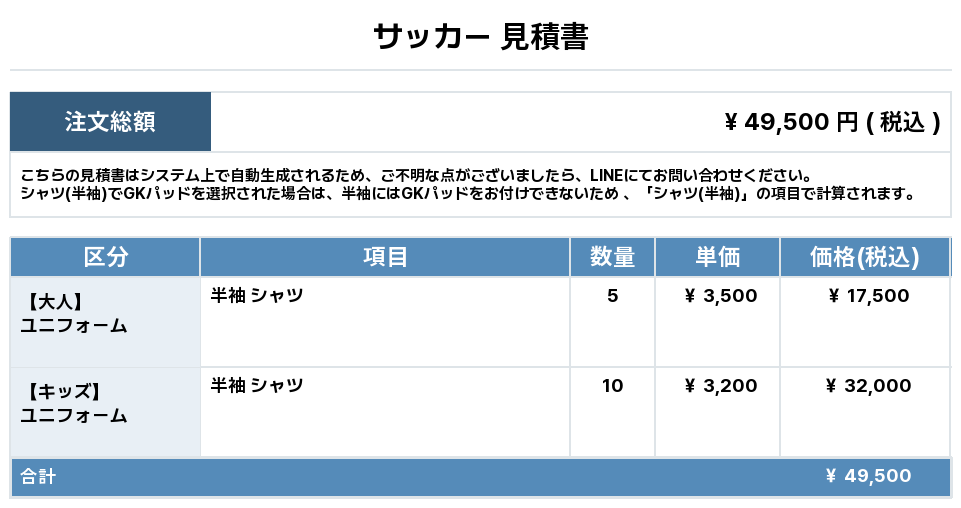 注文するユニフォームの最終デザインと見積もりの数量を確認ください。