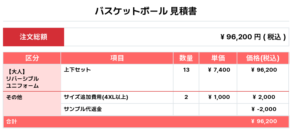 注文するユニフォームの最終デザイン、価格、数量をご確認ください。