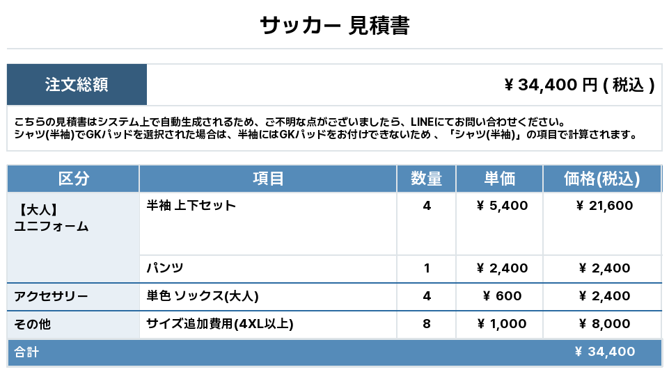 注文するユニフォームの最終デザインと見積もりの数量を確認ください。
