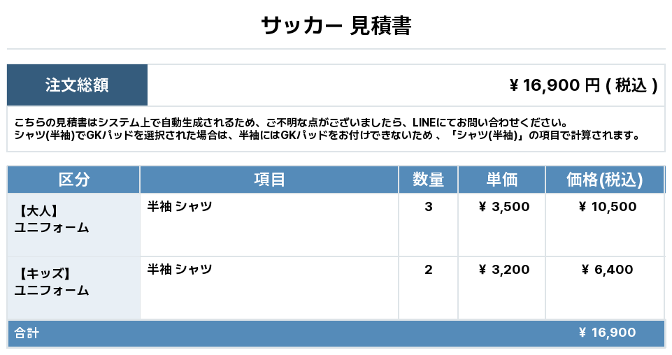 注文するユニフォームの最終デザインと見積もりの数量を確認ください。