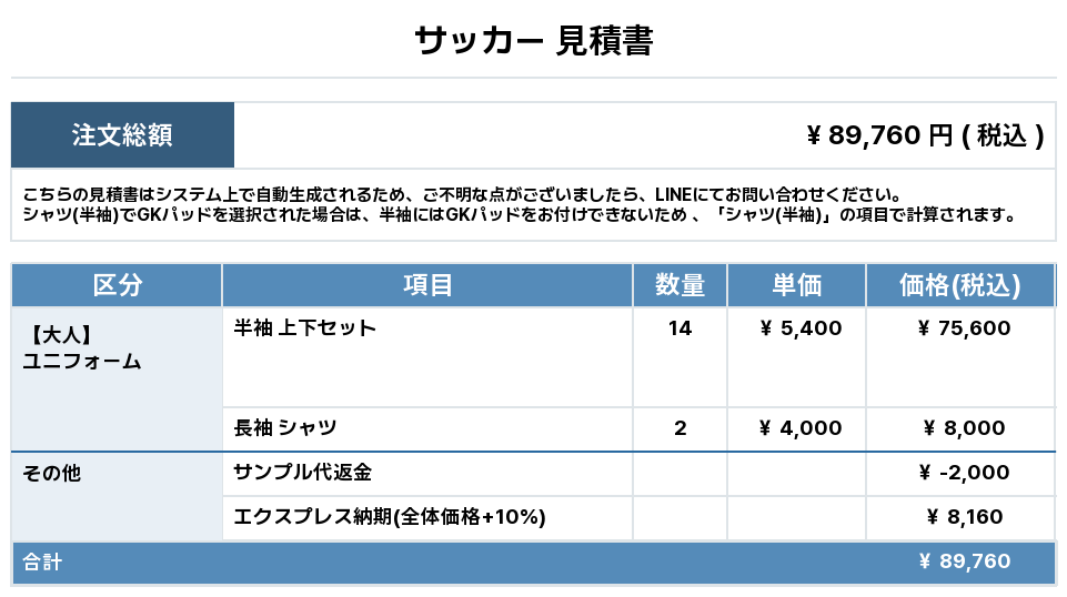 注文するユニフォームの最終デザインと見積もりの数量を確認ください。