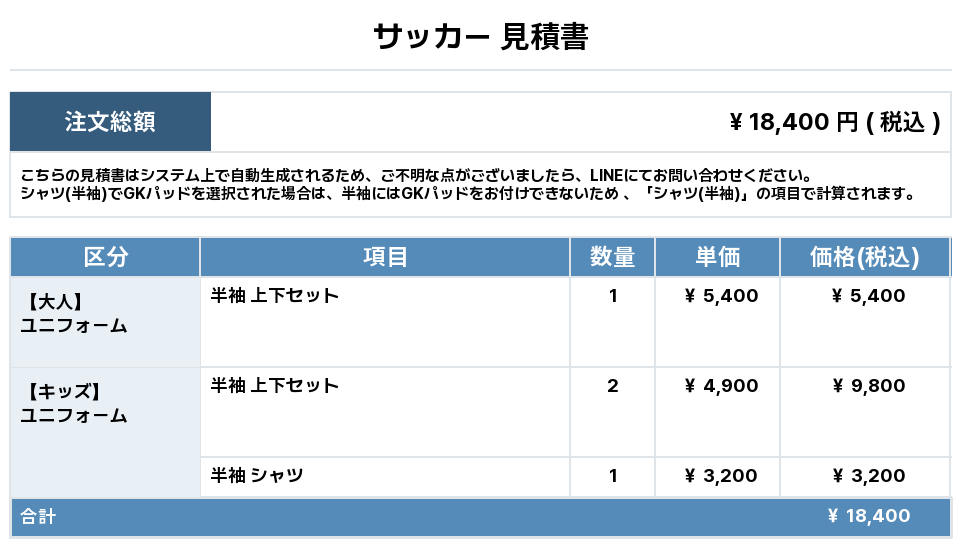 注文するユニフォームの最終デザインと見積もりの数量を確認ください。