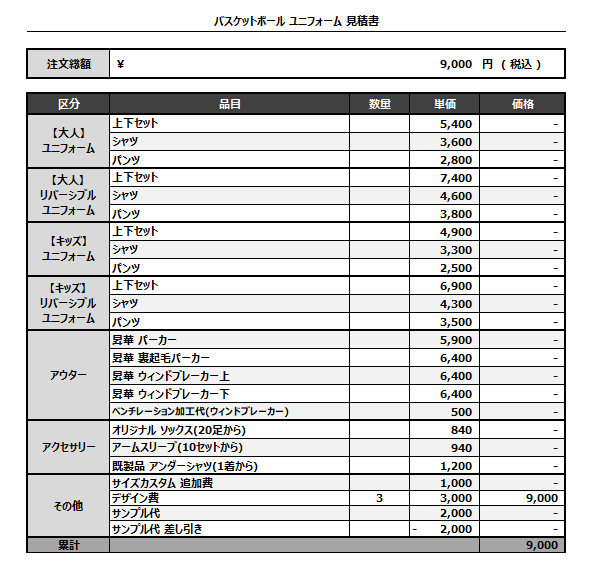 注文するユニフォームの最終デザイン、価格、数量をご確認ください。