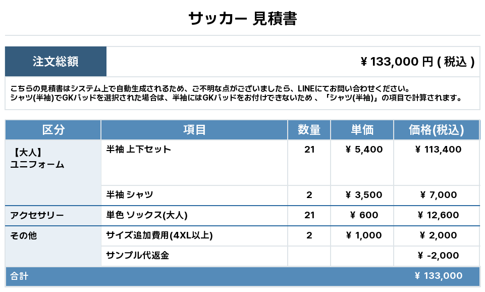 注文するユニフォームの最終デザインと見積もりの数量を確認ください。