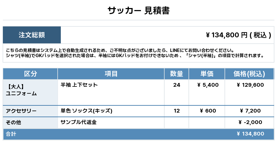 注文するユニフォームの最終デザインと見積もりの数量を確認ください。