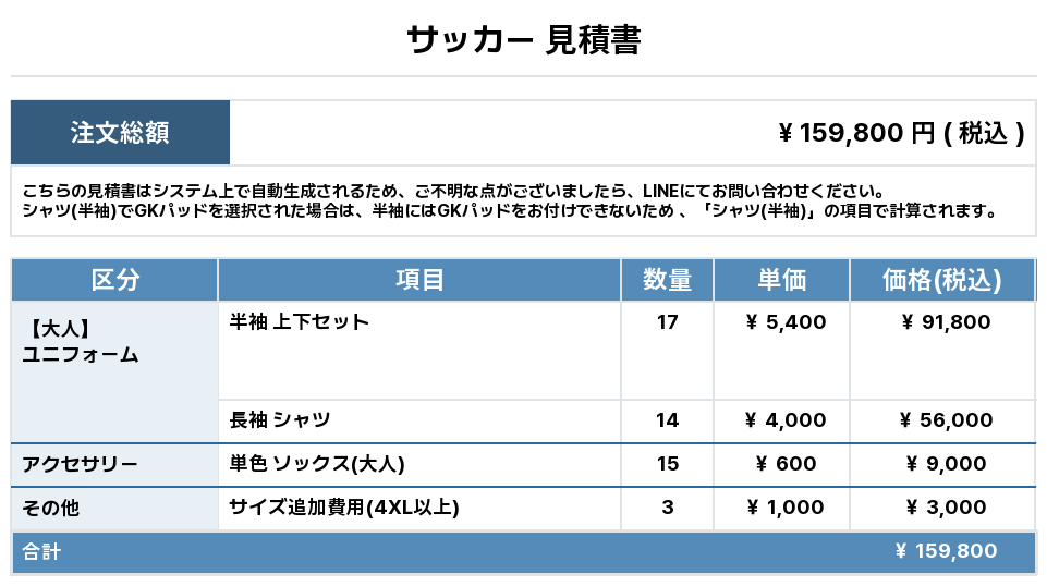 注文するユニフォームの最終デザインと見積もりの数量を確認ください。