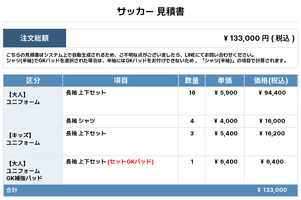 注文するユニフォームの最終デザインと見積もりの数量を確認ください。