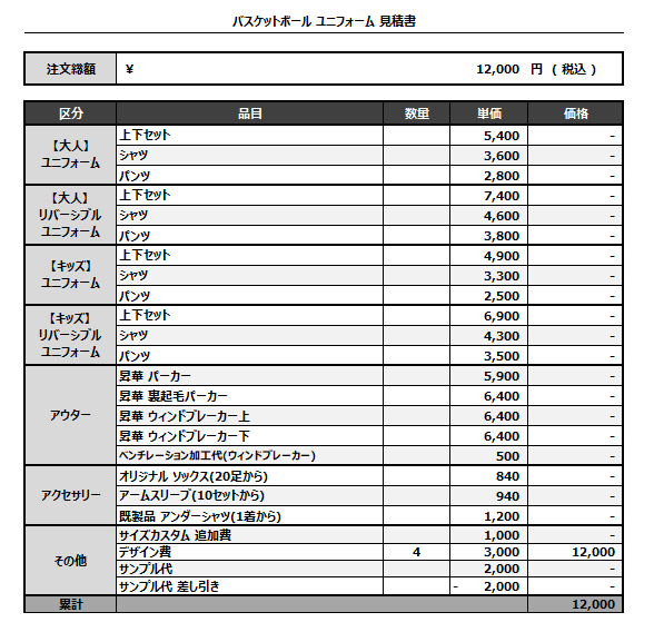 注文するユニフォームの最終デザイン、価格、数量をご確認ください。
