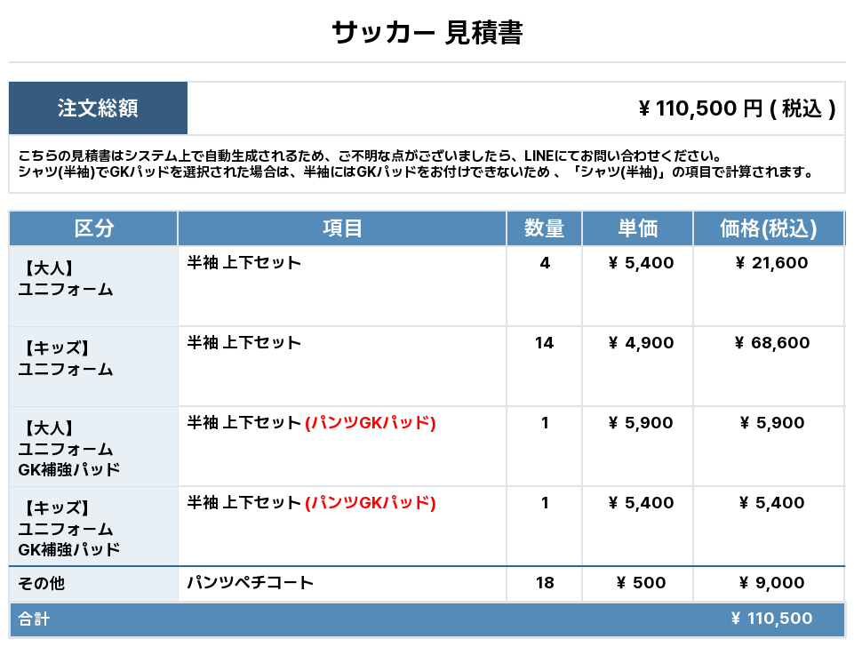 注文するユニフォームの最終デザインと見積もりの数量を確認ください。