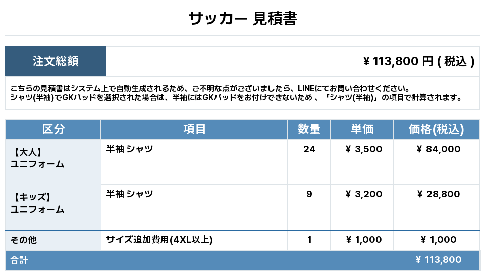 注文するユニフォームの最終デザインと見積もりの数量を確認ください。