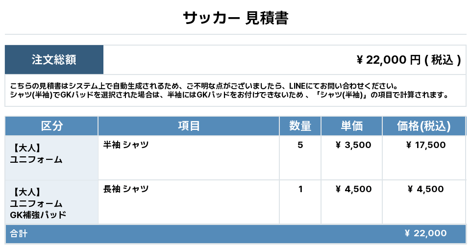 注文するユニフォームの最終デザインと見積もりの数量を確認ください。