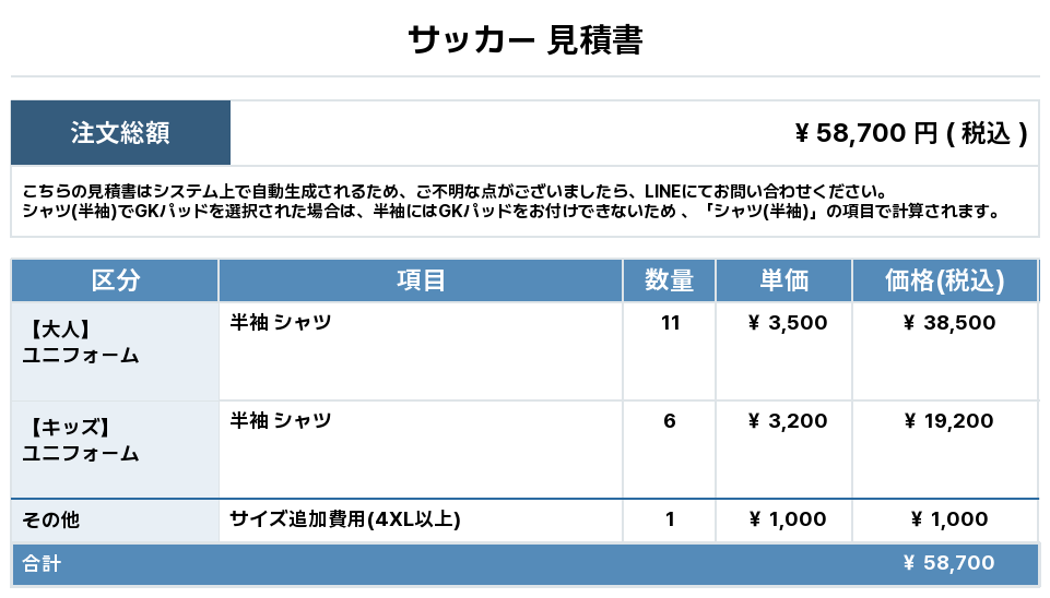 注文するユニフォームの最終デザインと見積もりの数量を確認ください。