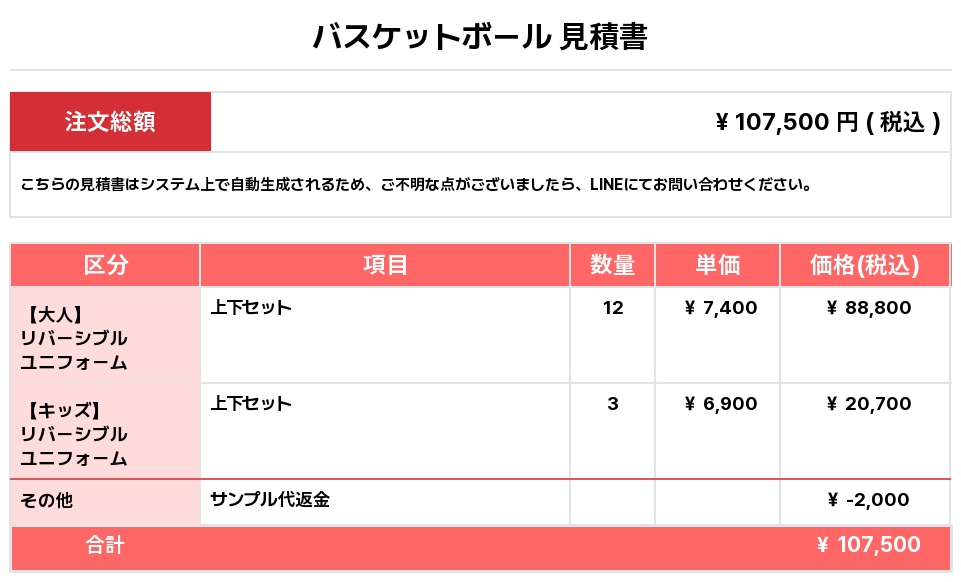 注文するユニフォームの最終デザイン、価格、数量をご確認ください。