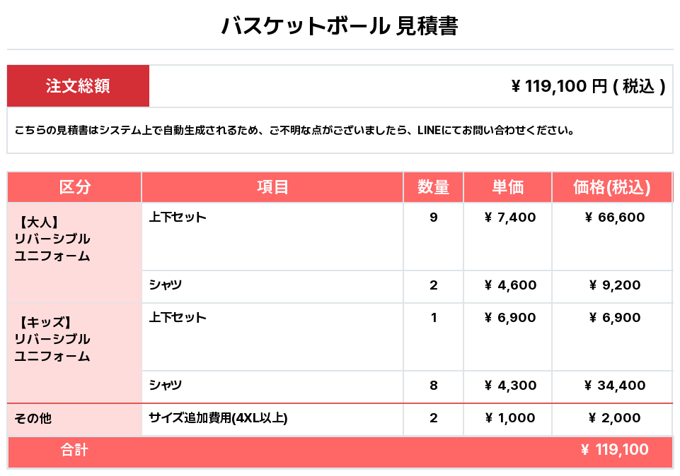 注文するユニフォームの最終デザイン、価格、数量をご確認ください。