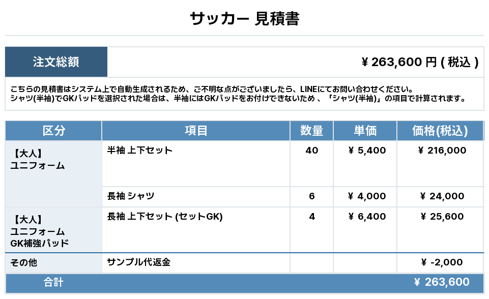 注文するユニフォームの最終デザインと見積もりの数量を確認ください。